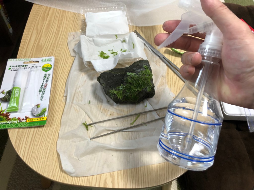 まずは、モスを小さく刻んで!接着剤を石に塗って!霧吹きをすると!くっつく!!!